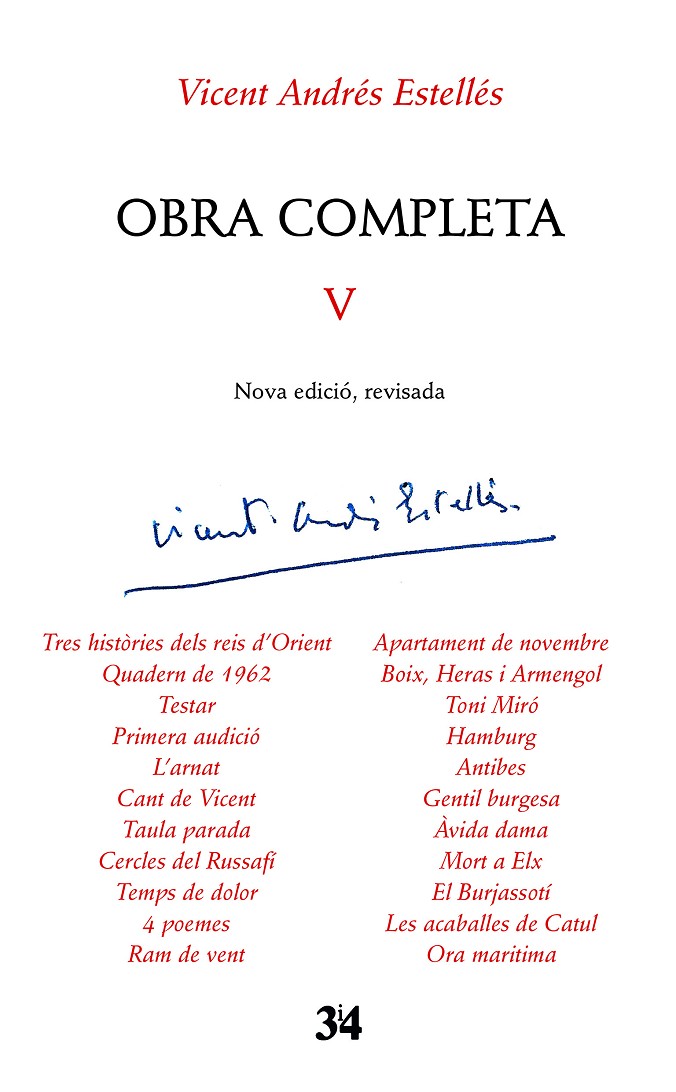 Aquest volum V de la nova edició de les obres completes ha estat preparat per Jordi Oviedo i inclou els següents llibres: Tres històries dels reis d’Orient, Quadern de 1962, Testar, Primera audició, L’arnat, Cant de Vicent, Taula parada, Cercles del Russafí, Temps de dolor, 4 poemes, Ram de vent, Apartament de novembre, Boix, Heras i Armengol, Toni Miró, Hamburg, Antibes, Gentil burgesa, Àvida dama, Mort a Elx, El Burjassotí, Les acaballes de Catul, Ora marítima.