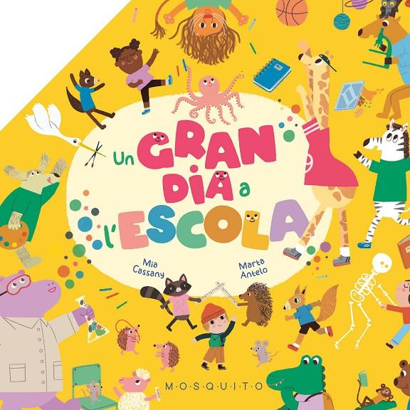 Per fi anem a l’escola! És tan divertit, aprendre molt i no parar de jugar! Aquesta, però, és una escola especial, perquè les nenes i els nens juguen amb els seus animalons inseparables. A l’hora del pati la girafa juga a bàsquet i el camaleó es disfressa de pilota. Al menjador, l’elefant beu aigua i els eriçons ballen damunt la taula. Al taller d’art el pop fa servir molts pinzells per pintar i al laboratori fan experiments amb els colors. Obre aquest llibre i veuràs com una gran il·lustració es desplega davant teu!