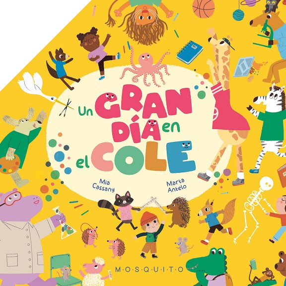 ¡Por fin vamos al cole! ¡Qué divertido es aprender mucho y jugar sin descanso! Este es un cole muy especial, porque las niñas y los niños juegan con sus animalitos inseparables. En el recreo la jirafa juega a la pelota y el camaleón se disfraza de balón. En el comedor el elefante se bebe el agua y los erizos bailan sobre la mesa. En el taller de arte el pulpo pinta con muchos pinceles y en el laboratorio experimentan con los colores. ¡Abre este libro y verás cómo una gran ilustración se despliega ante tus ojos!